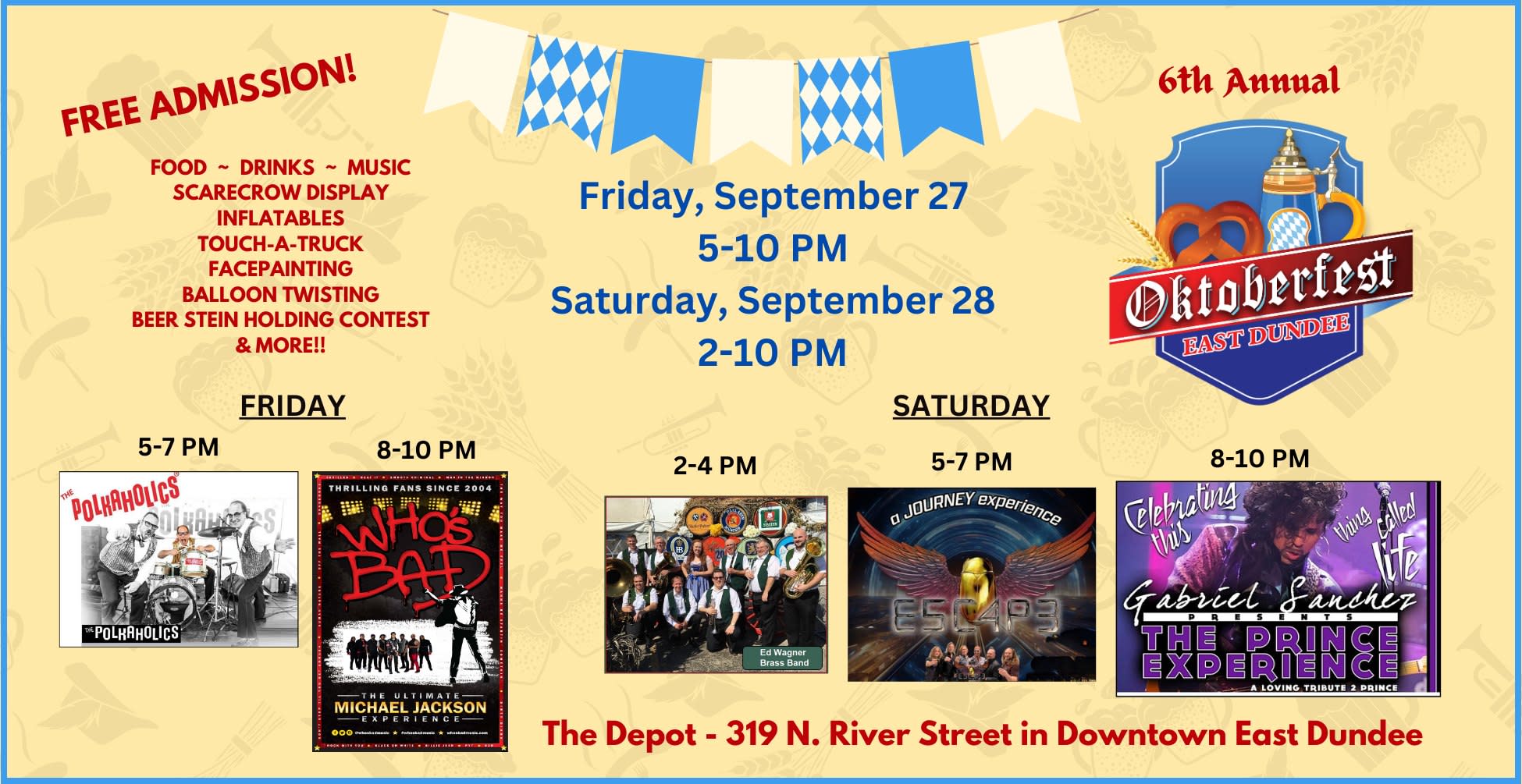 ๐ ๐๐๐ ๐๐ ๐ ๐๐๐๐๐๐ : Aliano's Ristorante DC Cobb's Duke's BBQ (at the Caboose) Happy's Bavarian Gourmet Soft Pretzels River Street Tavern Rosie O'Hare's VFW (Baked Goods) ๐๐๐๐๐๐๐๐ ๐๐๐๐๐: Served by River Street Tavern & Rosie O'Hare's ๐๐๐๐๐๐๐๐ ๐๐๐ ๐๐๐๐: Brewed by Black & Gray Brewing Co. (21 and over, ๐ ๐๐๐ wristband required) *** ๐ ๐๐๐๐๐ ๐๐๐๐๐ *** ๐๐ข๐ฏ๐ ๐๐ฎ๐ฌ๐ข๐ on the ๐๐ข๐ stage by: ๐๐๐๐๐๐๐๐๐๐๐ - ๐-๐ ๐ฉ๐ฆ Playing a high-speed collision of polka and rock 'n roll! High energy & FUN!!! ๐๐๐'๐ ๐๐๐ - ๐๐ก๐ ๐๐ข๐๐ก๐๐๐ฅ ๐๐๐๐ค๐ฌ๐จ๐ง ๐๐ฑ๐ฉ๐๐ซ๐ข๐๐ง๐๐ - ๐-๐๐ ๐ฉ๐ฆ Whoโs Badโs live performance is an unrivaled celebration of pop Musicโs one true King.....Michael Jackson! Whether you idolized the Jackson 5, fell in love to Human Nature, or learned to moonwalk to Billie Jean, Whoโs Bad is THE ULTIMATE music-and-dance driven Michael Jackson homage. We want to ROCK WITH YOU....ALL NIGHT!! ๐๐๐๐๐๐๐๐๐๐ ~ Scarecrow Display ~ STAR 105.5 LIVE Broadcast with morning radio personality Joe Cicero - ๐-๐ ๐ฉ๐ฆ ~ ๐ ๐๐๐ Inflatables Fun - ๐-๐ ๐ฉ๐ฆ ***************************************************************************** *** ๐๐๐๐๐๐๐๐ ๐๐๐๐๐ *** ๐๐ข๐ฏ๐ ๐๐ฎ๐ฌ๐ข๐ on the ๐๐ข๐ stage by: ๐๐ ๐๐๐๐๐๐'๐ ๐๐๐๐๐ ๐๐๐๐ - ๐-๐ ๐ฉ๐ฆ Playing a mix of Traditional German and American Polka songs to have you dancing to all the Oktoberfest favorites! ๐๐ ๐๐๐๐๐'๐ ๐๐๐๐๐๐ ๐๐๐๐๐๐๐ ๐๐๐๐๐๐๐ - ๐-๐ ๐ฉ๐ฆ LP Vinyl brings their exciting and energetic tribute to Journey - to East Dundee!! ๐๐๐ ๐๐๐๐๐๐ ๐๐๐๐๐๐๐๐๐๐ - ๐-๐๐ ๐ฉ๐ฆ A Tribute to Prince!! Gabriel Sanchez fronts the country's most dynamic Prince Tribute Band. The Prince Experience will be Playing all of the greatest hits!! *** ๐๐๐๐๐๐๐๐๐๐ ** ~ Scarecrow Display ~ ๐ ๐๐๐ Inflatables Fun - ๐-๐ ๐ฉ๐ฆ ~ Touch-A-Truck - ๐-๐ ๐ฉ๐ฆ ~ ๐ ๐๐๐ Face Painting by The Funky Bush & Palette - ๐:๐๐-๐:๐๐ ๐ฉ๐ฆ ~ ๐ ๐๐๐ Balloon Twisting - ๐:๐๐-๐:๐๐ ๐ฉ๐ฆ ~ Scarecrow Stilt Walker - ๐:๐๐-๐:๐๐ ๐ฉ๐ฆ ~ Beer Stein Holding Contest - ๐ ๐ฉ๐ฆ (Contest to take place in front of the Big Stage) ๐๐ Outside alcoholic beverages allowed. ๐๐ Admission Fee!!!