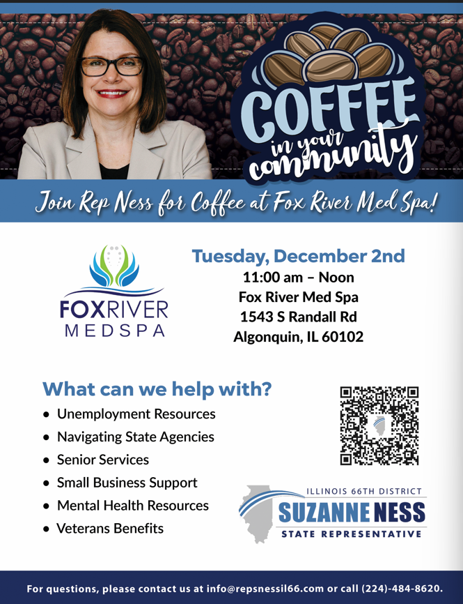 Join Representative Ness for casual conversation. Learn about state resources, small business support, mental health resources, Veteran's benefits or bring your questions.
