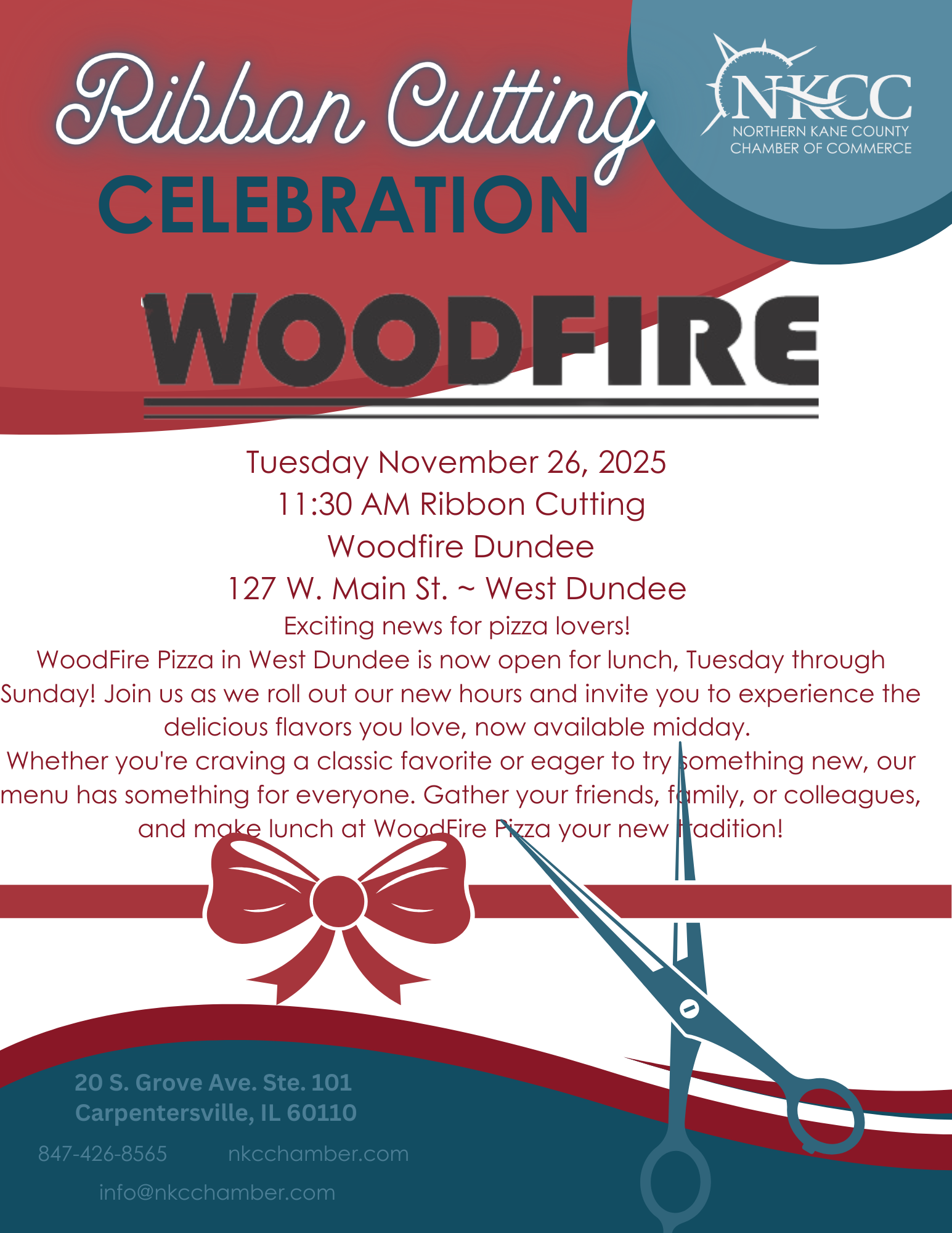 Tuesday November 26, 2024 11 AM Ribbon Cutting Woodfire Dundee 127 W. Main St. ~ West Dundee Exciting news for pizza lovers! WoodFire Pizza in West Dundee is now open for lunch, Tuesday through Sunday! Join us as we roll out our new hours and invite you to experience the delicious flavors you love, now available midday. Whether you're craving a classic favorite or eager to try something new, our menu has something for everyone. Gather your friends, family, or colleagues, and make lunch at WoodFire Pizza your new tradition!