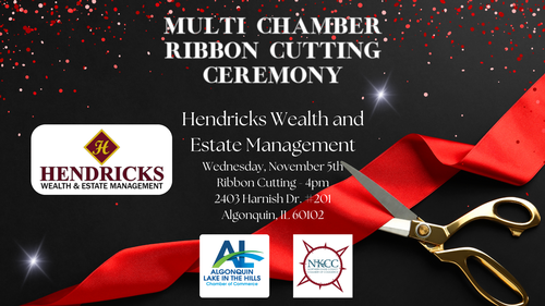 Join Us for a Multi-Chamber Ribbon Cutting for Hendricks Wealth & Estate Management! We're teaming up with the Algonquin/ Lake in the Hills chamber to celebrate! Come for the Ribbon Cutting and stay to network with fellow business owners during an Open House with appetizers. Hendricks Wealth will be raising money to support Hoof, Woof & Meow Animal Rescue!