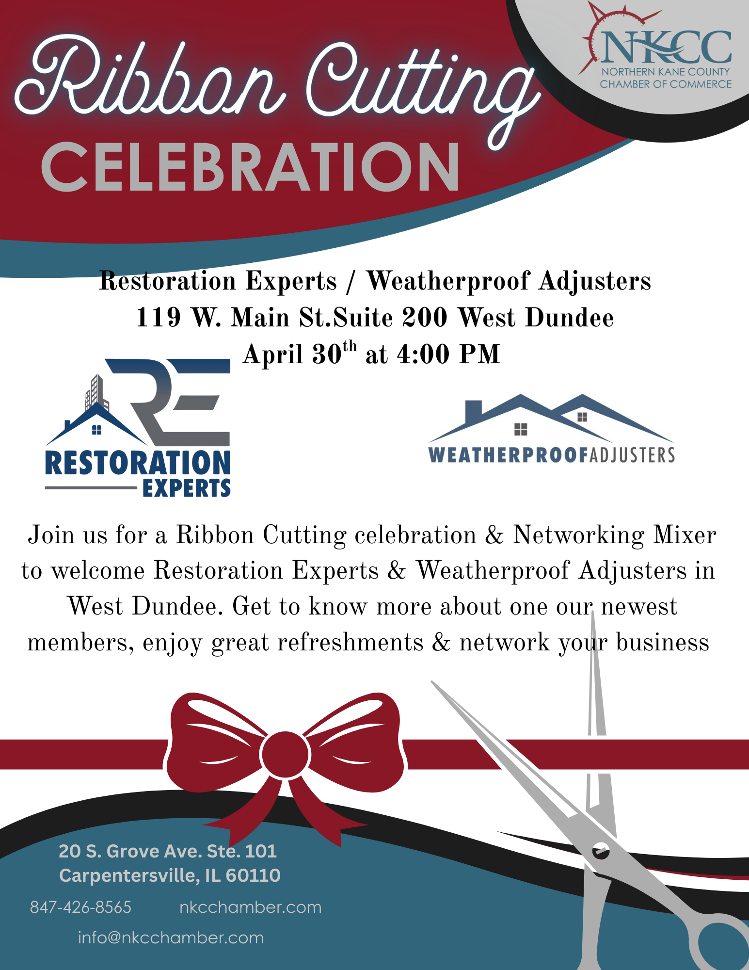 Join us for a celebration, ribbon cutting & networking mixer with Weatherproof Adjusters & Restoration Experts in West Dundee! Enjoy great refreshments, connect with others, & promote your business.