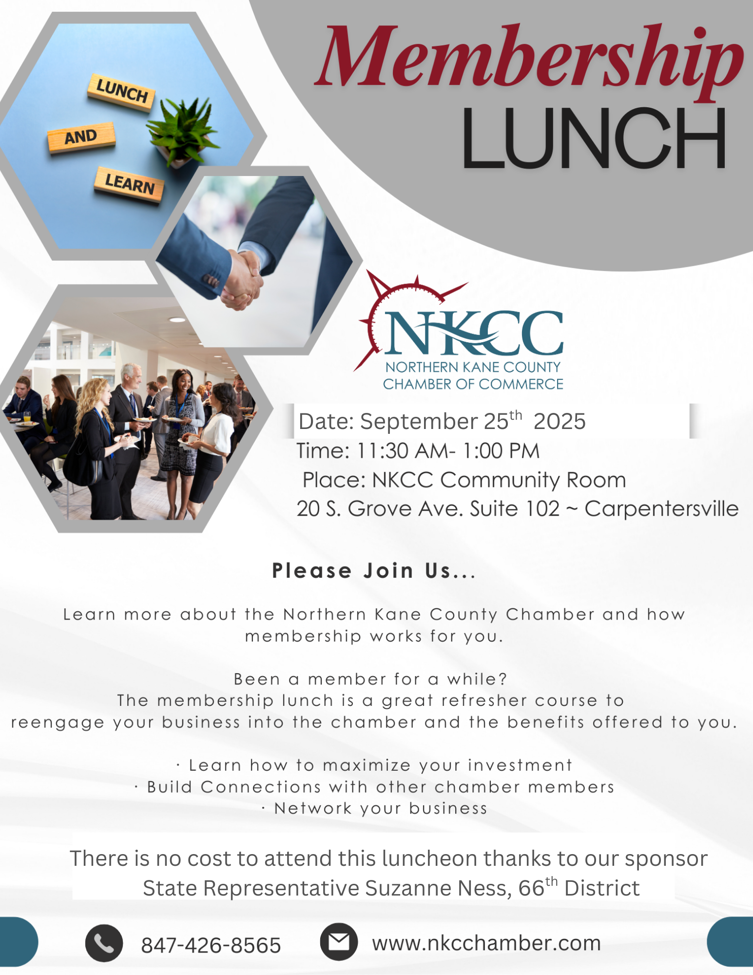 Please Join Us... Learn more about the Northern Kane County Chamber and how membership works for you. Been a member for a while? The membership lunch is a great refresher course to reengage your business into the chamber and the benefits offered to you. Learn how to maximize your investment Build Connections with other chamber members Network your business