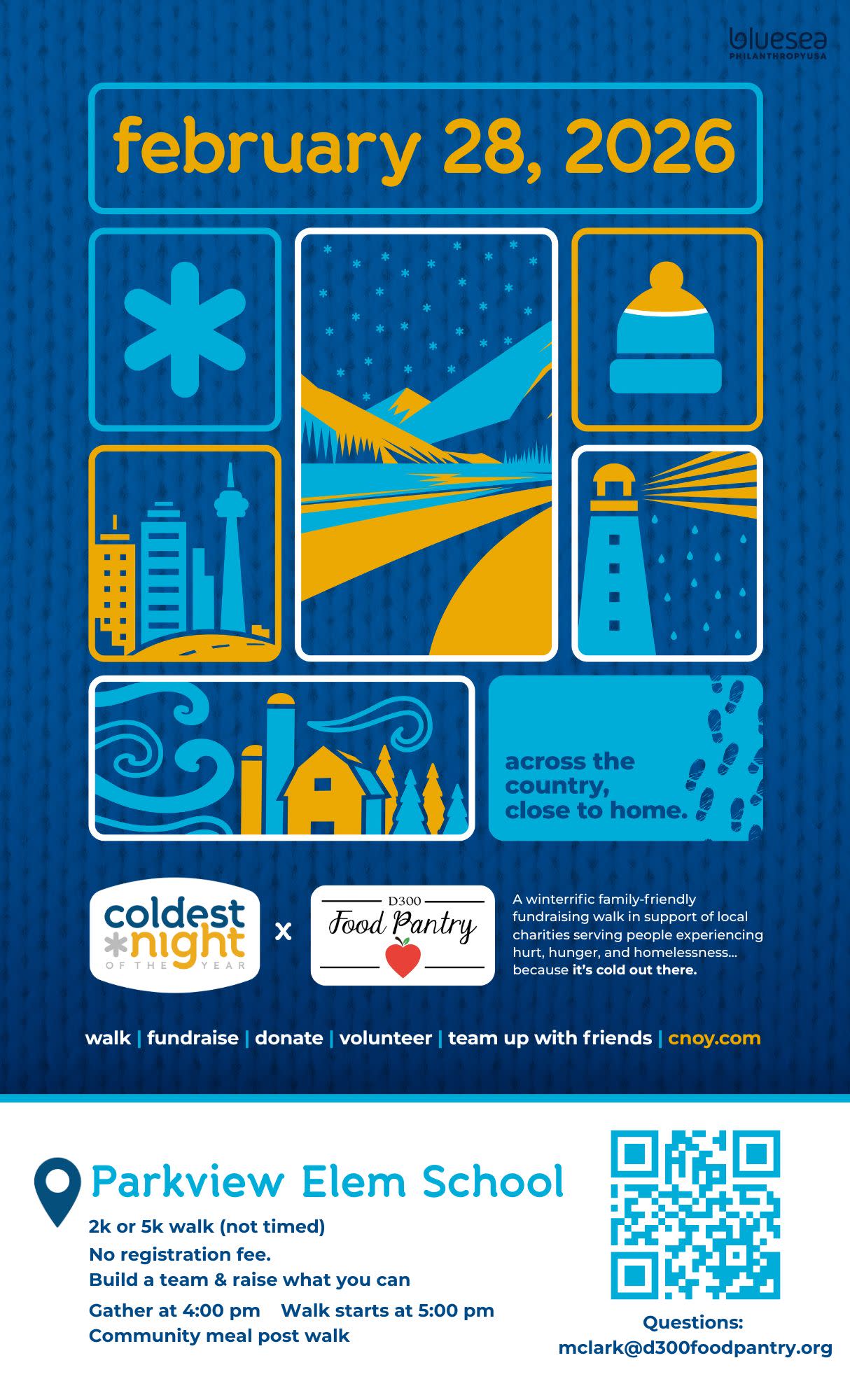 You won't want to miss this event! The D300 Food Pantry works to make sure no student in D300 goes to school hungry! To make this mission possible we are hosting our first annual "Coldest Night of the Year" 5k walk on February 28th. YES, it will be cold, which is the point. Imagine facing homelessness or hunger especially during the coldest days of the year. Come out of the coziness of your home to do something important while having fun. Walk with a cup of hot chocolate, and celebrate your accomplishment post walk with a cup of chili or soup donated by Duke's BBQ and Sunrise Social Captain. There are so many ways to participate...start a team, join a team, be a sponsor or donate what you can. https://cnoy.com/location/carpentersville